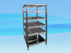 ステンレス製なので錆や腐食に強く、薬品工場など特殊な環境に最適の棚。洗浄した容器などを置いても床に滴が落ちないよう、一番下段は水受けになっています。